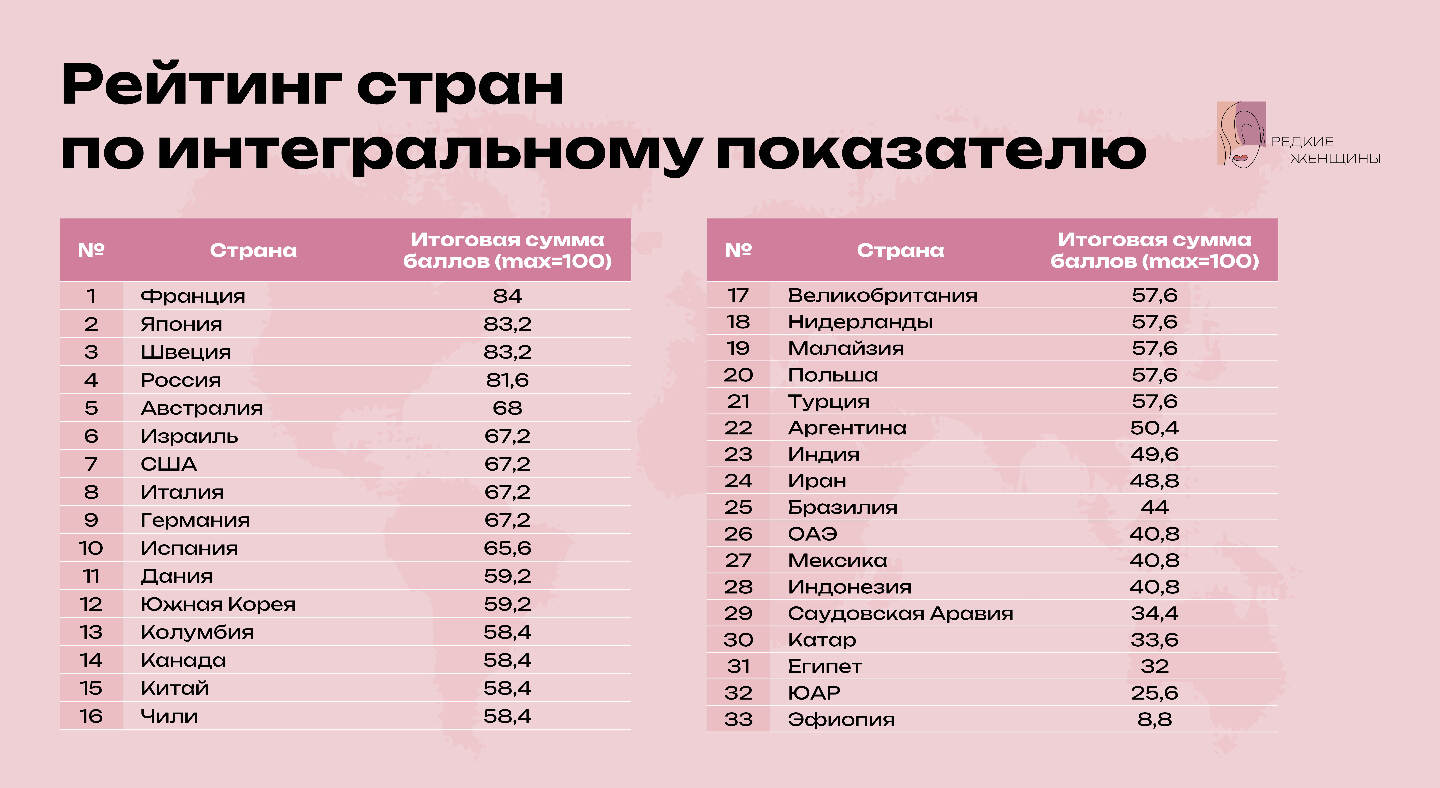 Всего были исследованы 33 страны в шести регионах мира: Европа, Северная Америка, Латинская Америка, Азия, Ближний Восток и Африка. На основе собранных данных для каждой страны был рассчитан интегральный показатель, отражающий уровень системной защищенности и поддержки женщины в контуре орфанной помощи. Ключевой методологический принцип исследования состоит в том, что оно оценивает степень интеграции этих мер в устойчивую систему сопровождения семьи, а не наличие отдельных мер само по себе.